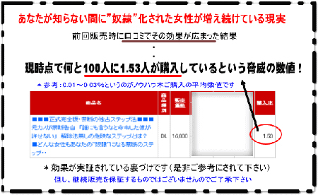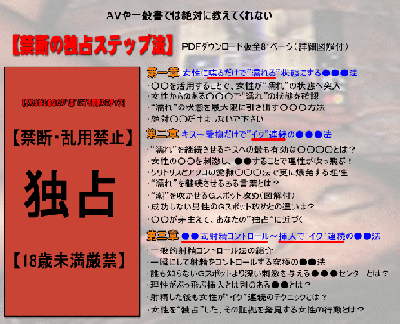 ページ数81Pで3部構成となっております。 その他のセックスノウハウ本によくある精神論を 長々と書いているものではありません。 全ての要点だけをまとめて誰にでもわかりやすく 即実行できるように構成しております。 誰でも"奴隷"化が可能なのでしょうか? 効果が100%発揮されるまでの時間は個人差があります。 ただし、本セックスノウハウ本は単なるsex,会話術 のノウハウではなく「奴隷」を目的としております。 本マニュアルを読んでいただくとわかると思いますが、 たとえ今現在不細工、短小、早漏な方でも男性税印が 実行可能です。 追加部数で本当に販売停止するのですか? 今現在決断をくだすことが難しい男性から販売延長の要望も 多数頂いておりますが、公平性を最後まで維持する意味でも ご要望にお答えすることはできません。 本書は悪用・乱用厳禁の非常に危険な洗脳ノウハウであり 永久的に販売することが難しいのも本書を読んでいただくことで 十分ご理解頂けると思います。 奴隷にした女性への解除方法はないのでしょうか? 私を見て頂くとわかるように、今でも元彼に抱かれたいと 思っております。”少しでも彼の役に立ちたい!”と思って このノウハウを作ったのですから、その後のことまで実際 考えていませんでした。 だからあなたに接した女性が一生あなたに抱かれたいと思う この洗脳ノウハウが危険だということがご理解いただけたのでしょうか? この洗脳ノウハウを利用してのお金儲け等の不当行為だけは絶対 やめて下さい。このことを約束していただけない方は購入をお控え下さい。 *上記ノウハウ使用をストップする事が解除法としてはベストという報告も受けております 本ノウハウは催眠術、また違法ではありませんので、ご安心下さい。 (効果を裏付ける証拠ですのでご参考下さい) 宣伝一切無しの口コミによる販売です (ご購入された方へのサポートも保証しております) ■■■正式完全版・禁断の独占ステップ法■■■ 元カノが禁断告白 「誰にも言うなと命令した彼が許せない」 解除法無しの危険なステップとは? ■どんな女性もあなたの”奴隷”になる禁断のステップ・・ PR